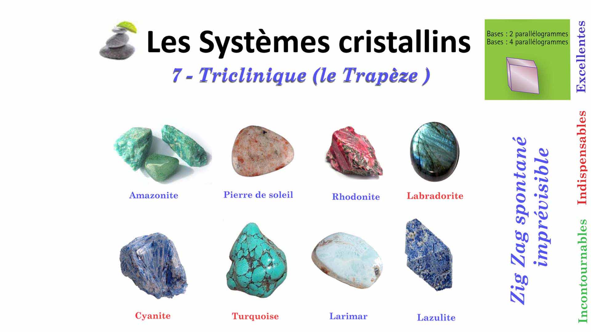 Nous manifestons certains comportements ou qualités différentes selon les expériences que nous vivons. Nous pourrions aussi considérer que dans chaque trait de caractères, nous manifestons des qualités, mais parfois des névroses. En utilisant les pierres qui vous ressemblent autant dans vos qualité que dans vous limitations, vous réalisez le défi de transformer vos névroses en qualités. En réalisant le petit test du LithoQuizz, vous découvrez les traits de caratère détaillés de la géométrie cristalline qui vous convient. Sur les planches ci-dessous, découvrez les pierres qui vous veulent du bien. Portez-les et vivez avec elles.